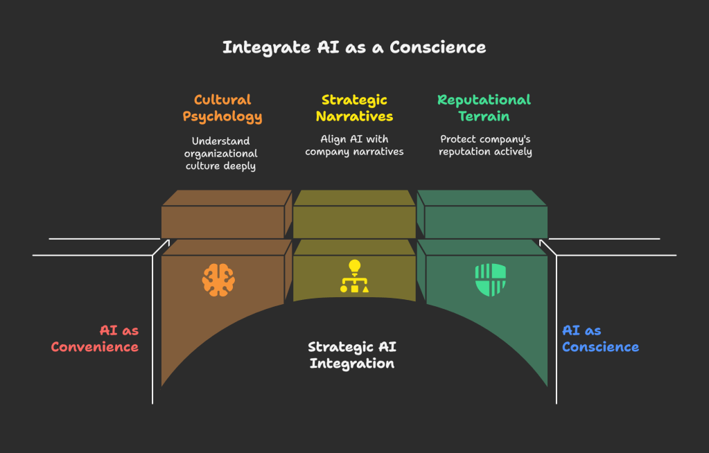 I provide comprehensive AI integration strategy that protects your reputation while positioning you for technological leadership. My approach combines technical understanding with strategic communications expertise to ensure your AI adoption strengthens rather than undermines your brand.